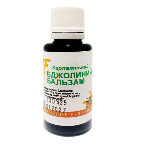 Склад: екстракти бджолиного підмору (тіла бджоли медоносної), квиткового пилку, суниці, брусниці, червоного винограду.